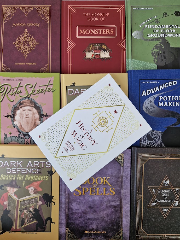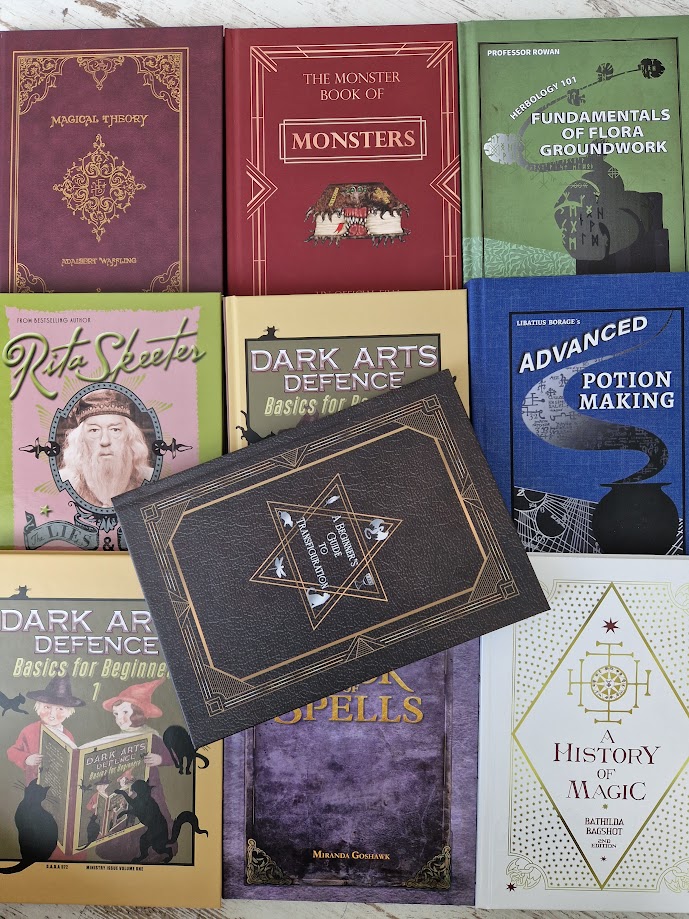 The Monster book of Monsters, Theory of magic, Dark Arts defence basics Beginners: Part 1, Dark Arts defence basics Beginners: Part 2, Lies and the life of Albus, History of Magic, Transfiguration, Book of Spells, Herbology, Potion Making