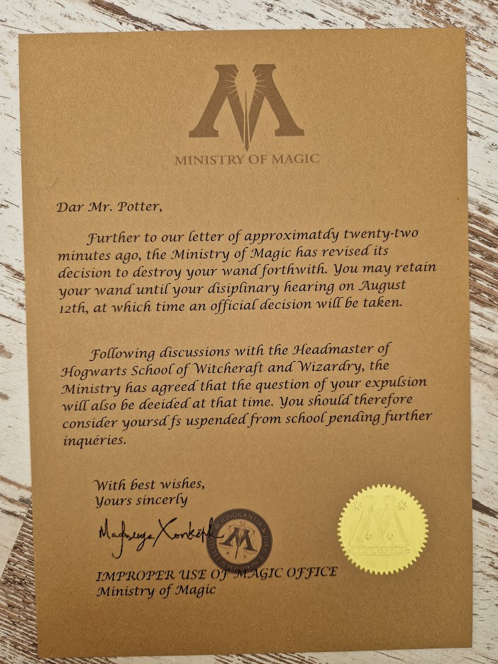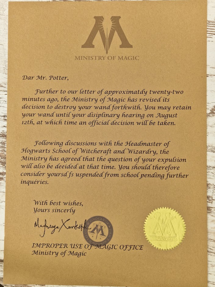 Printouts: Letter of expulsion from the School of Wizards