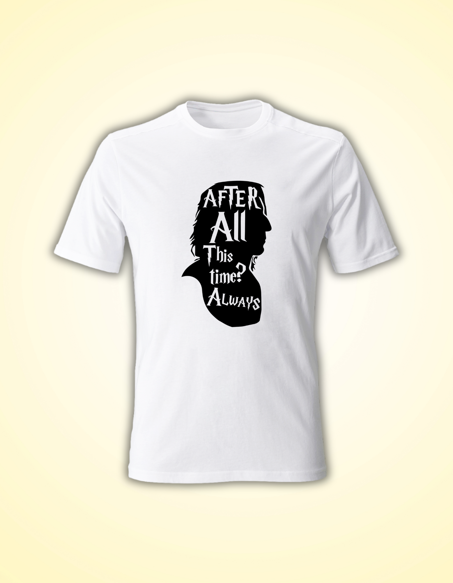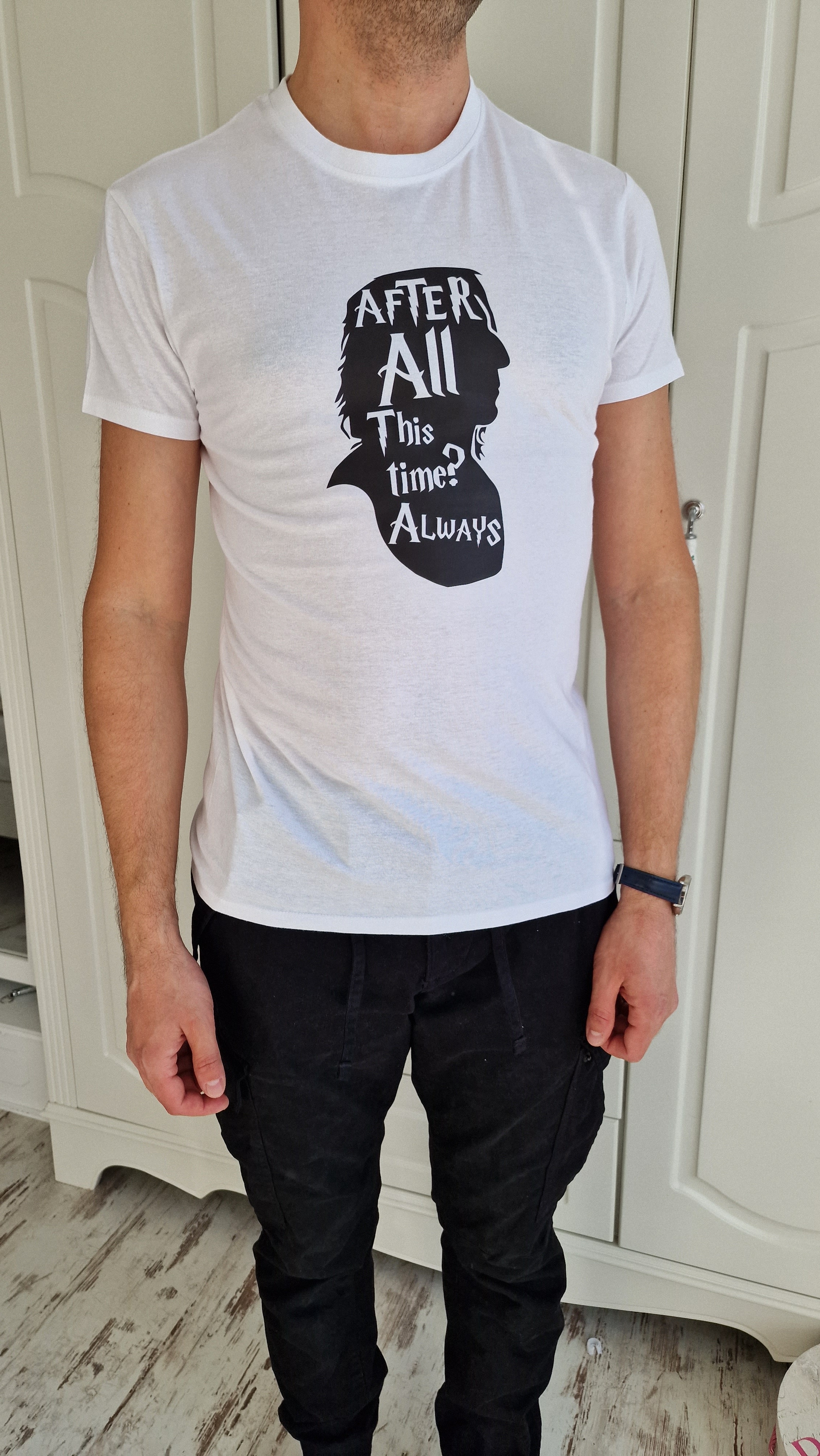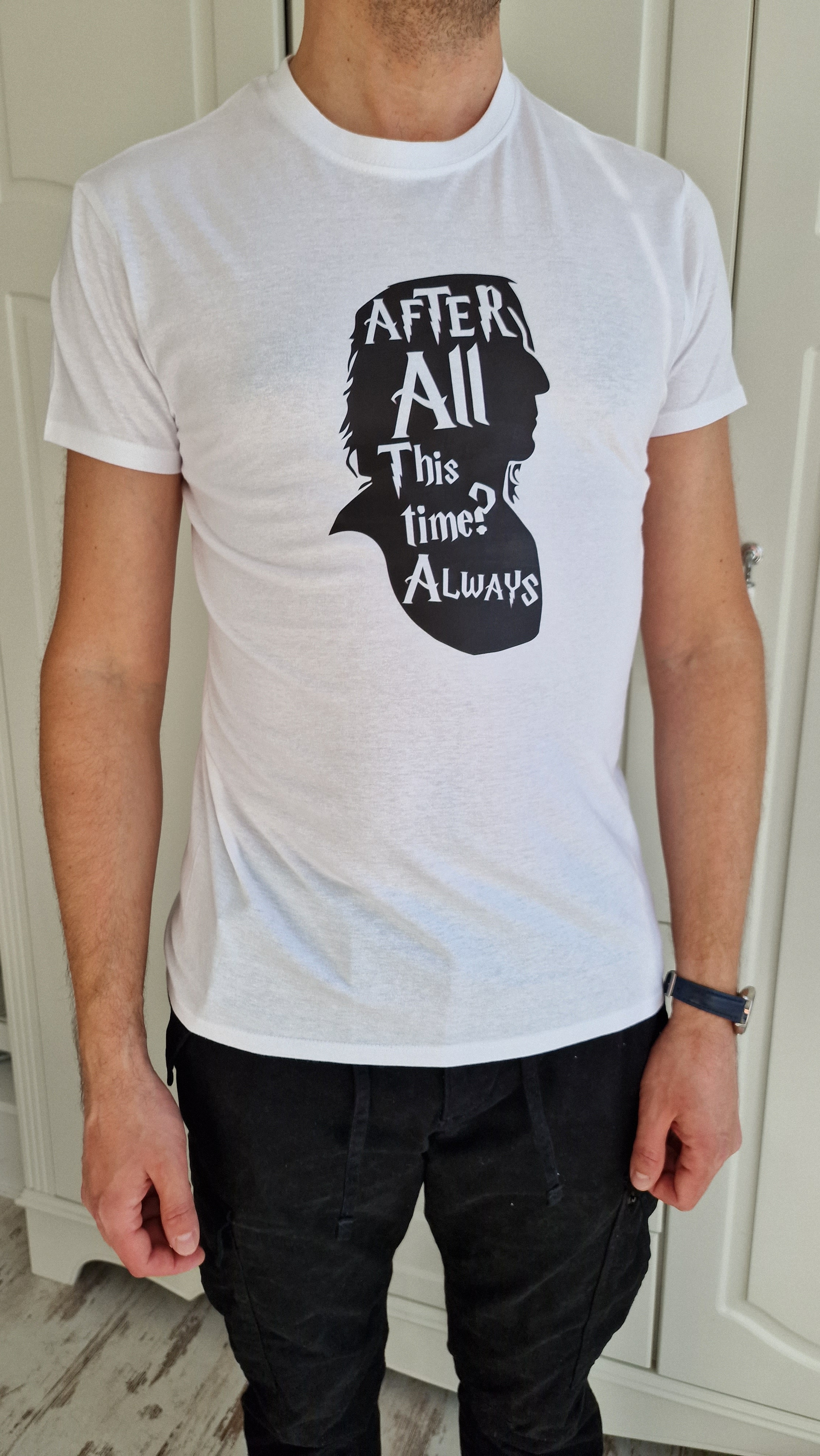 A men's white t-shirt featuring the iconic phrase "All this time" from the Potter series is a subtle yet powerful way for fans to express their love for the magical world of School of Wizards.