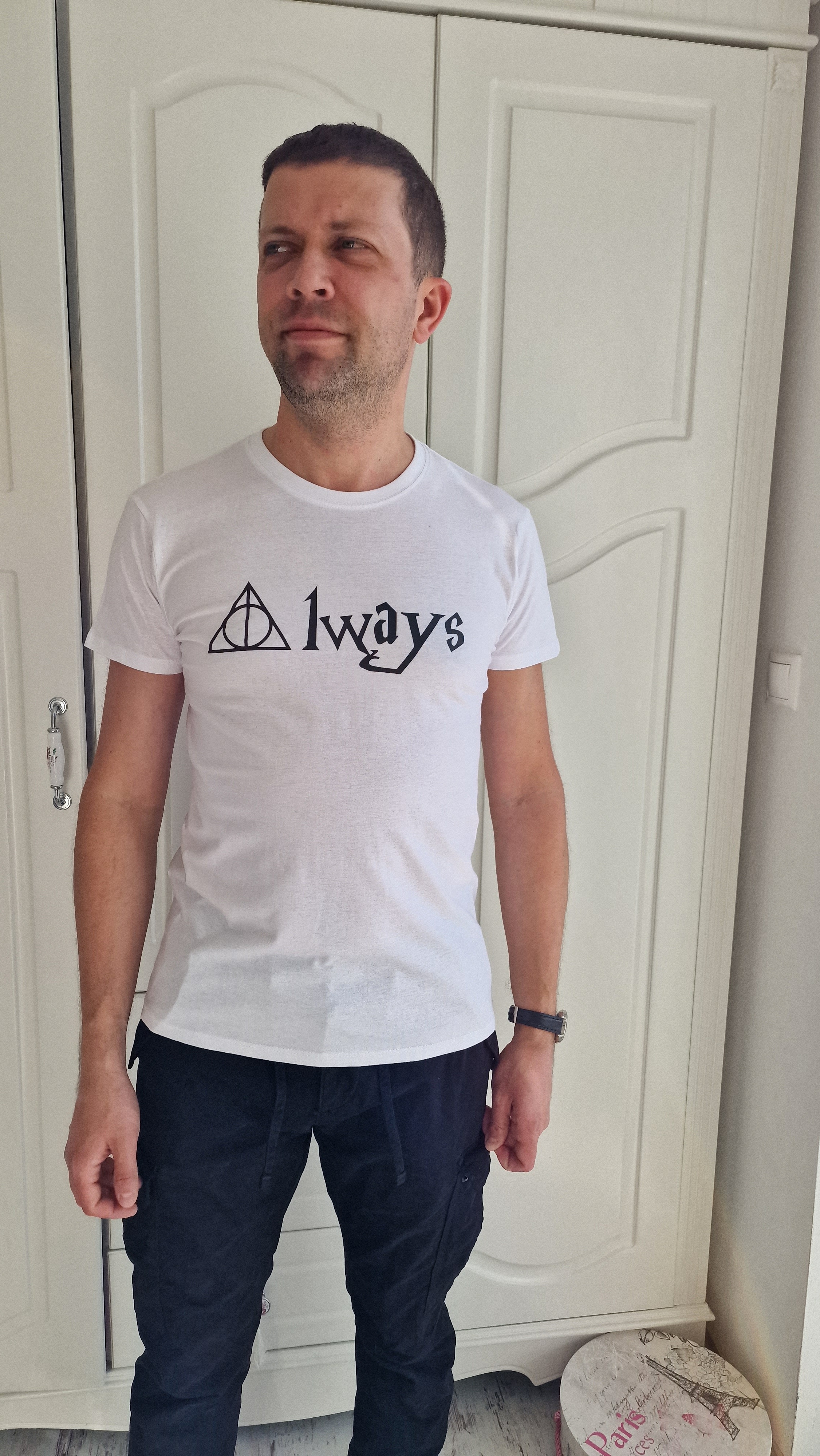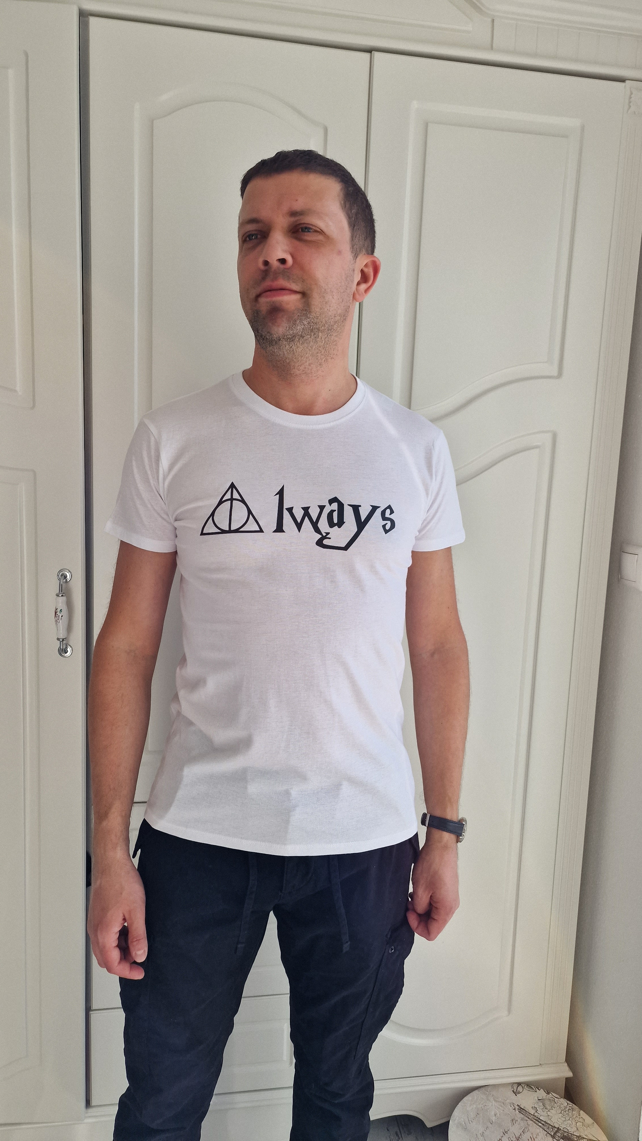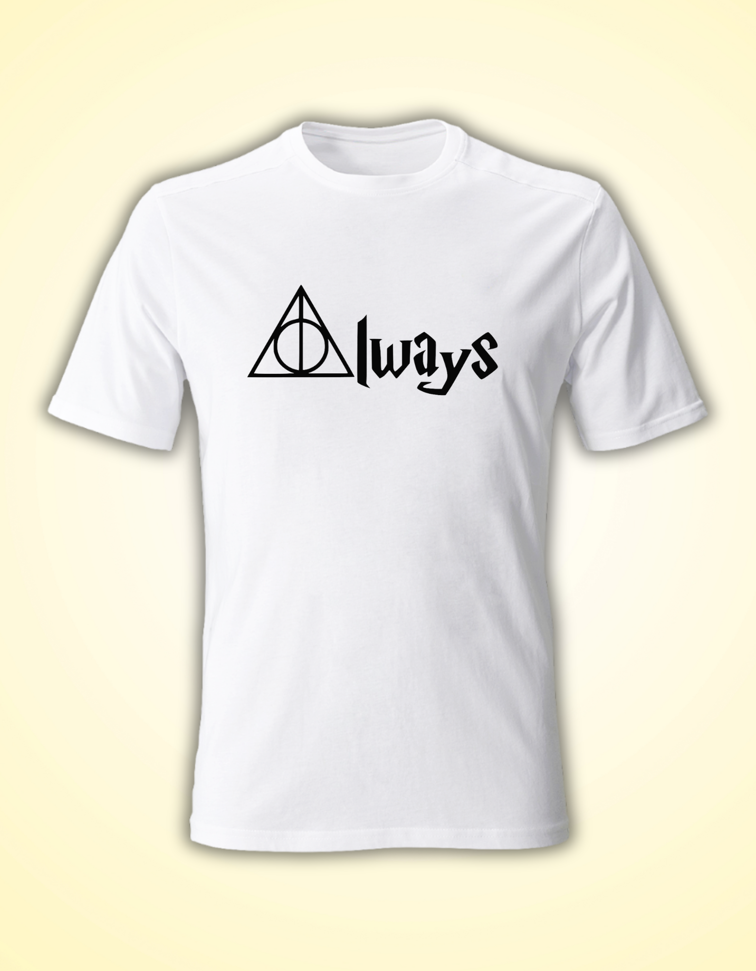 The elegant combination of the white t-shirt with the "Always" drawing creates a sophisticated yet understated look that can be styled in various ways. Whether paired with jeans and sneakers for a casual outing or layered under a blazer for a more polished ensemble, this t-shirt allows fans to carry a piece of the magical universe with them wherever they go.