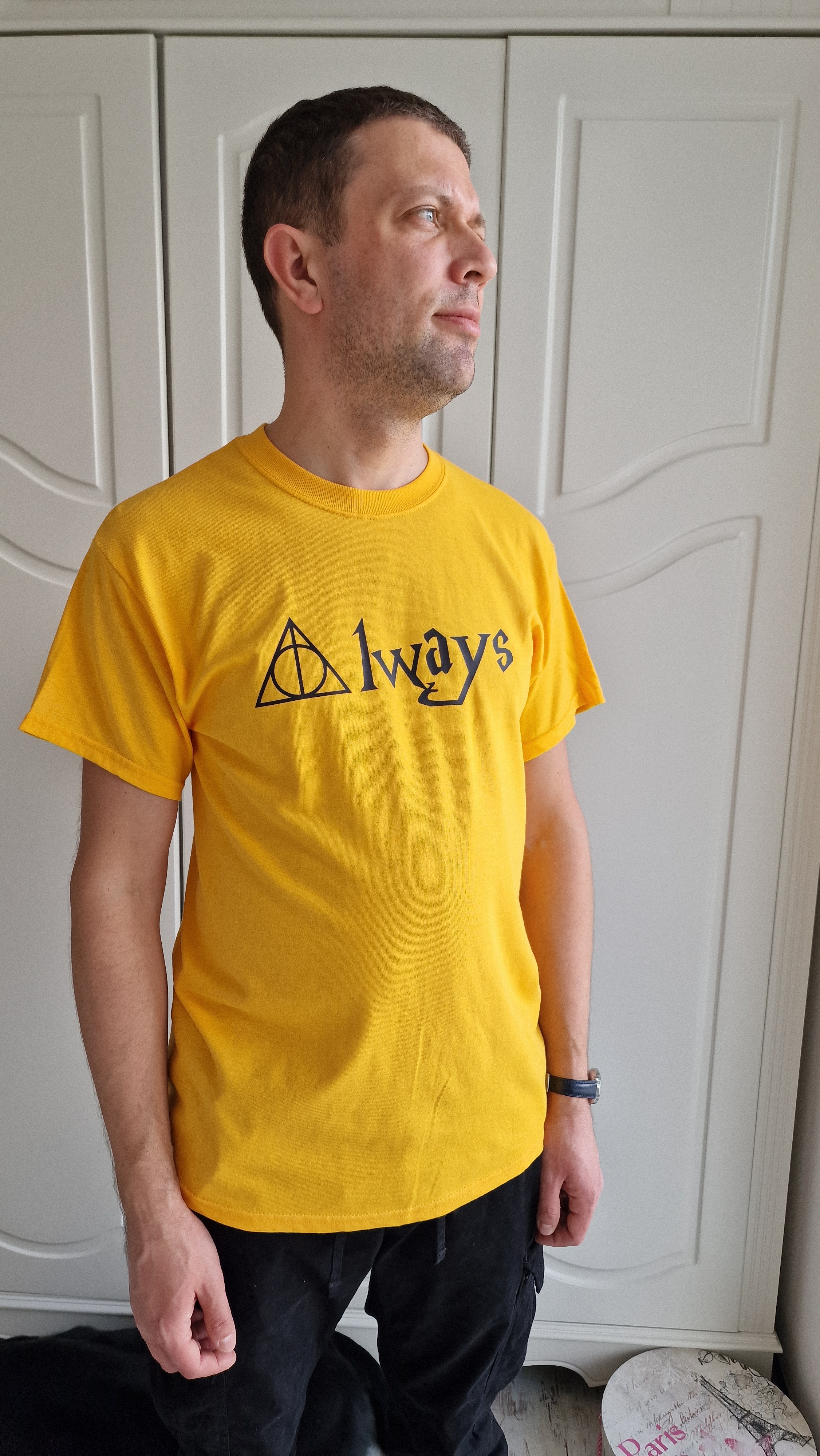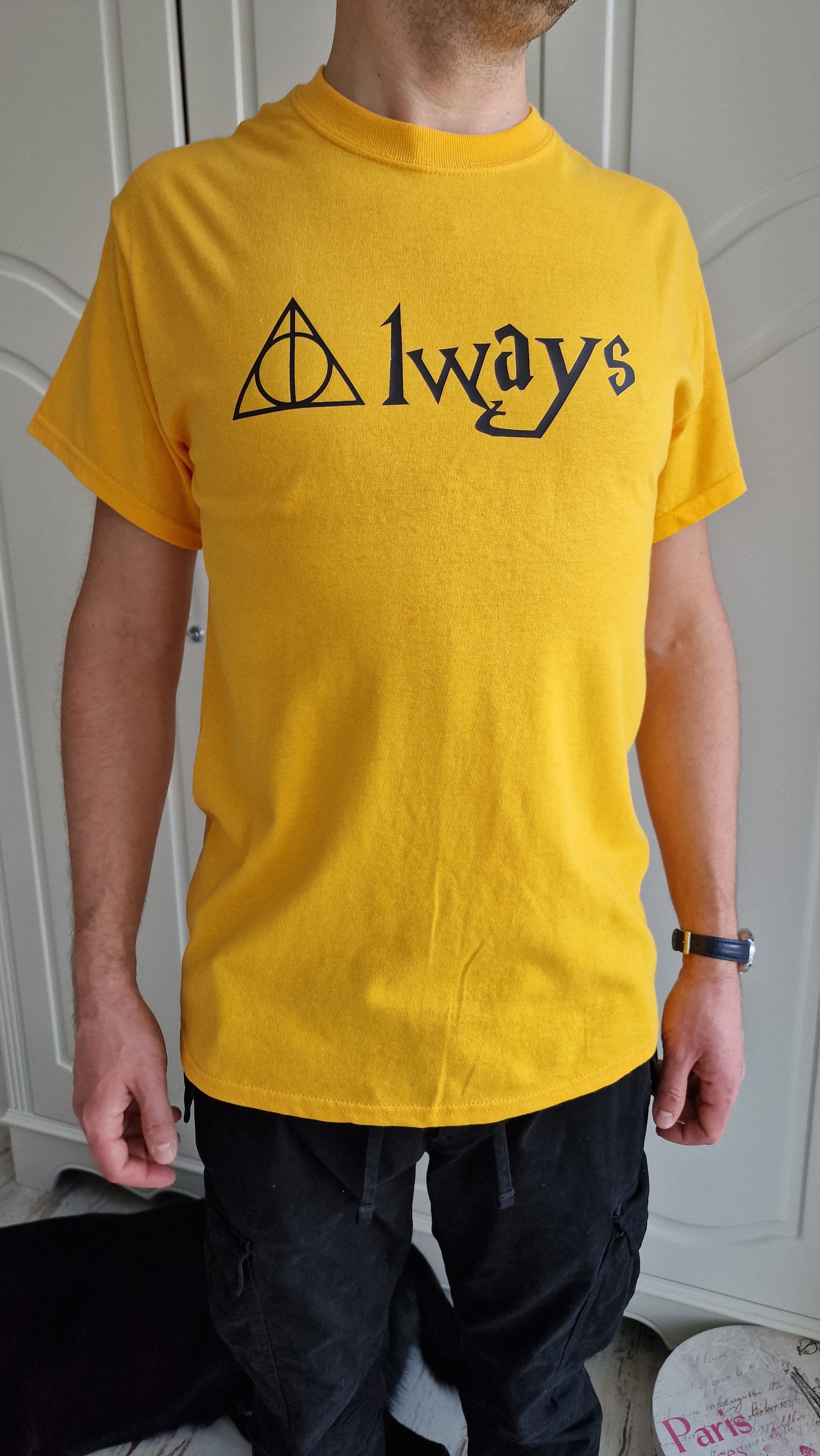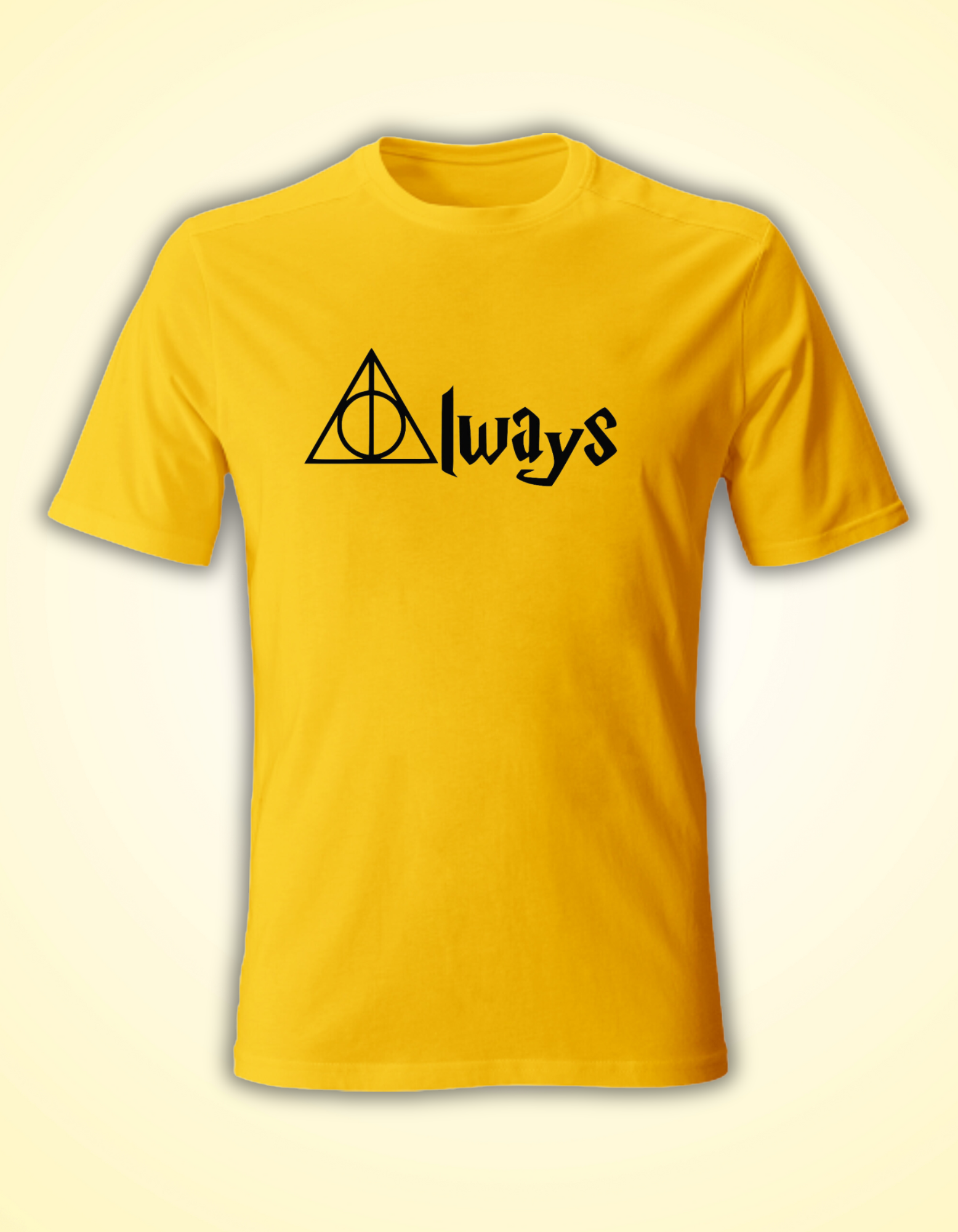 Men's yellow t-shirt -"Always", clothing for Potter-head fans