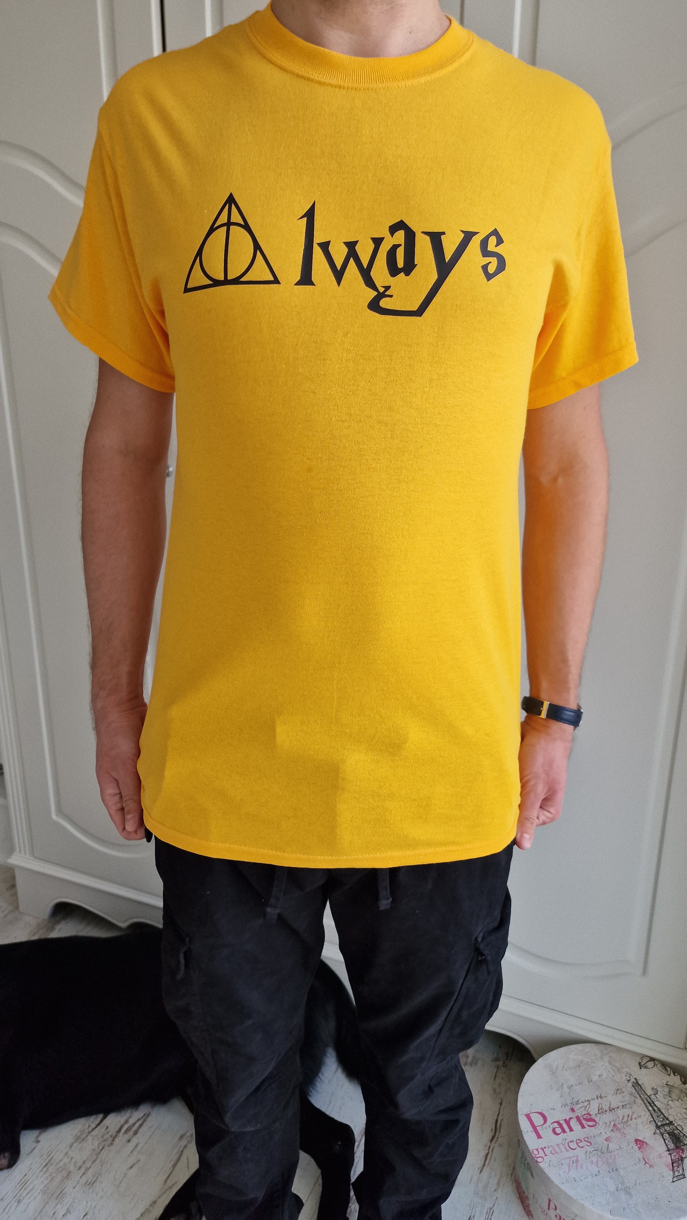 The monochromatic appeal of the yellow t-shirt provides the perfect backdrop for the emotional impact of the "Always" drawing. This word holds deep significance for fans of a particular magical world, symbolizing unwavering love and loyalty.