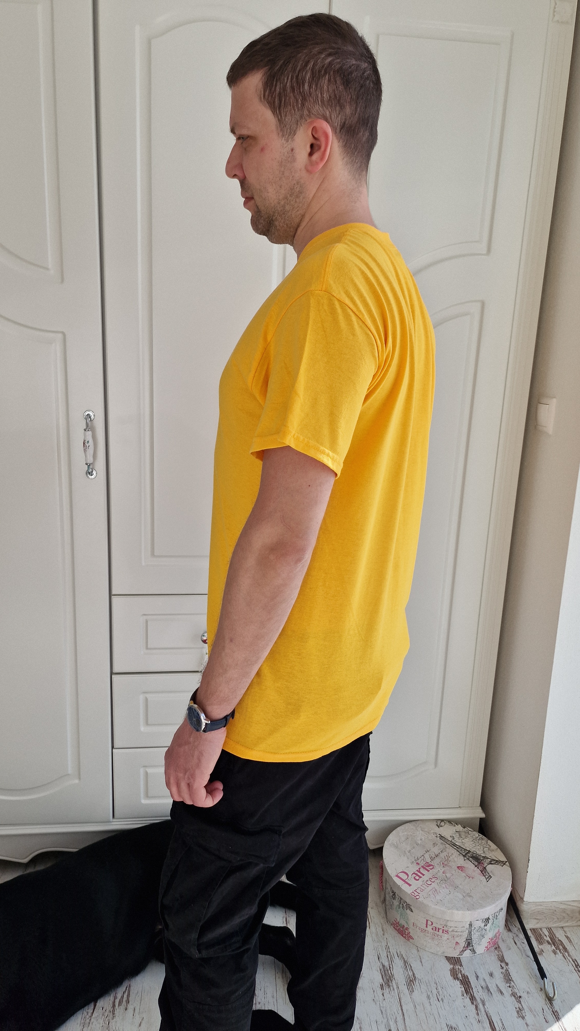 Paired with jeans or worn over a jacket, the men's yellow t-shirt with the "Always" drawing exudes an atmosphere of understated elegance and subtle charm. Whether worn casually or dressed up for a party, this t-shirt allows the wearer to express their emotions and connect with a deeper meaning that transcends mere fashion.