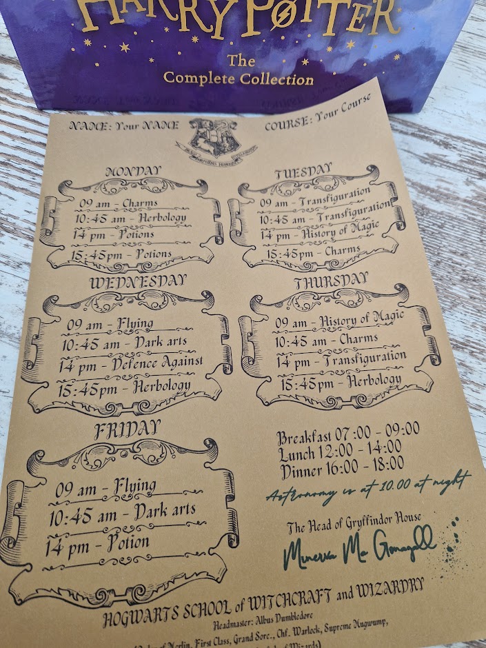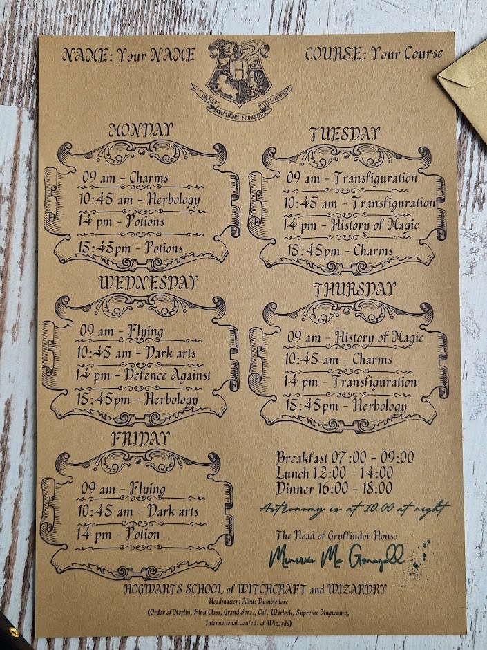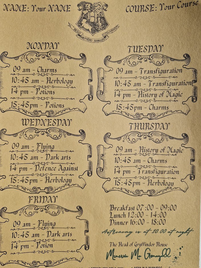 Printouts: Schedule of classes at the school of wizards - for Potter-head fans