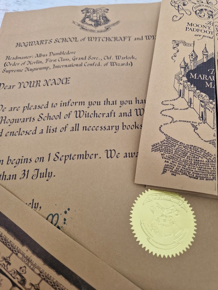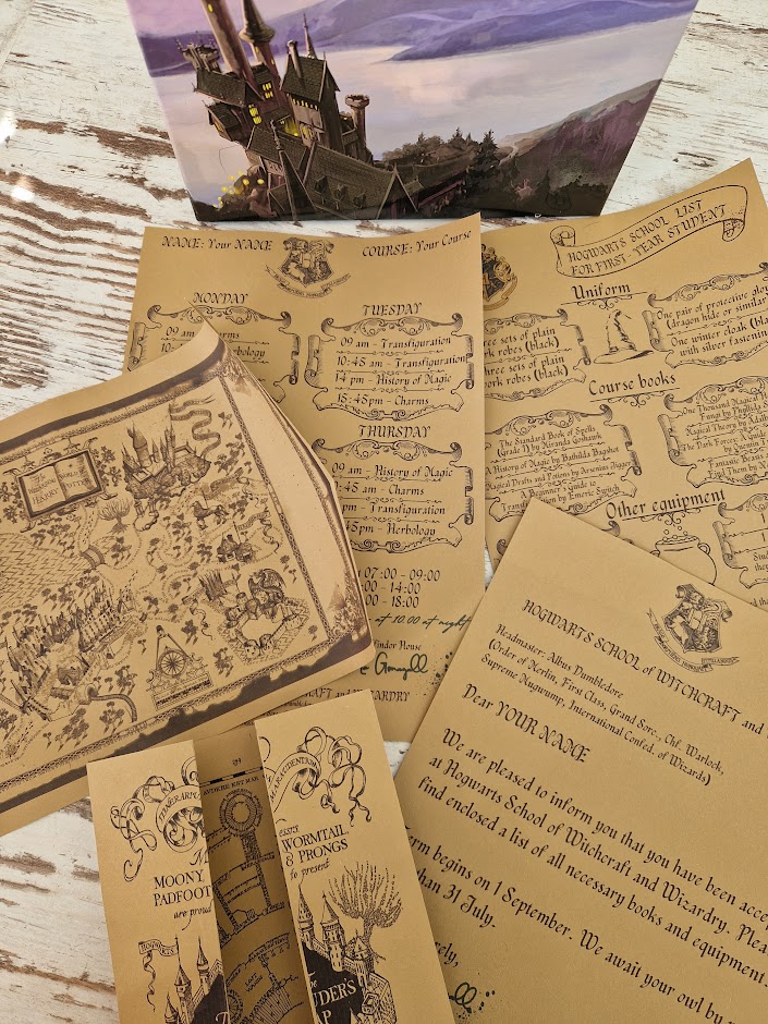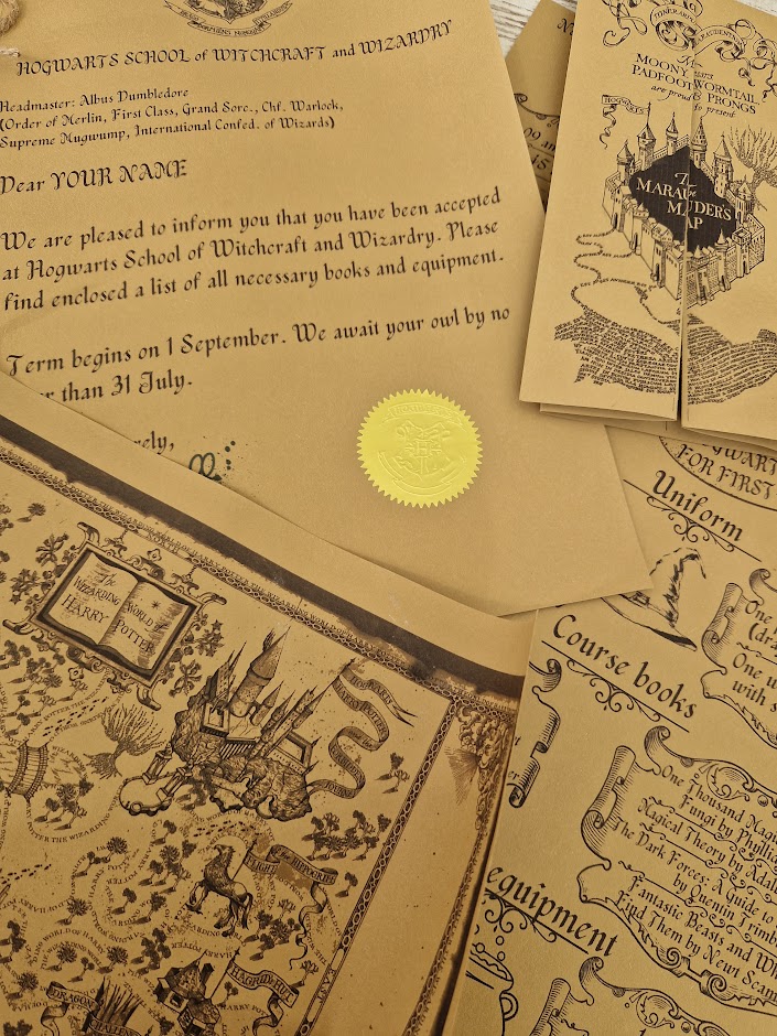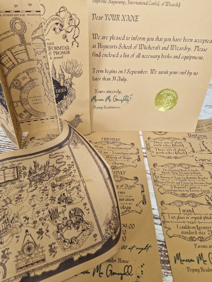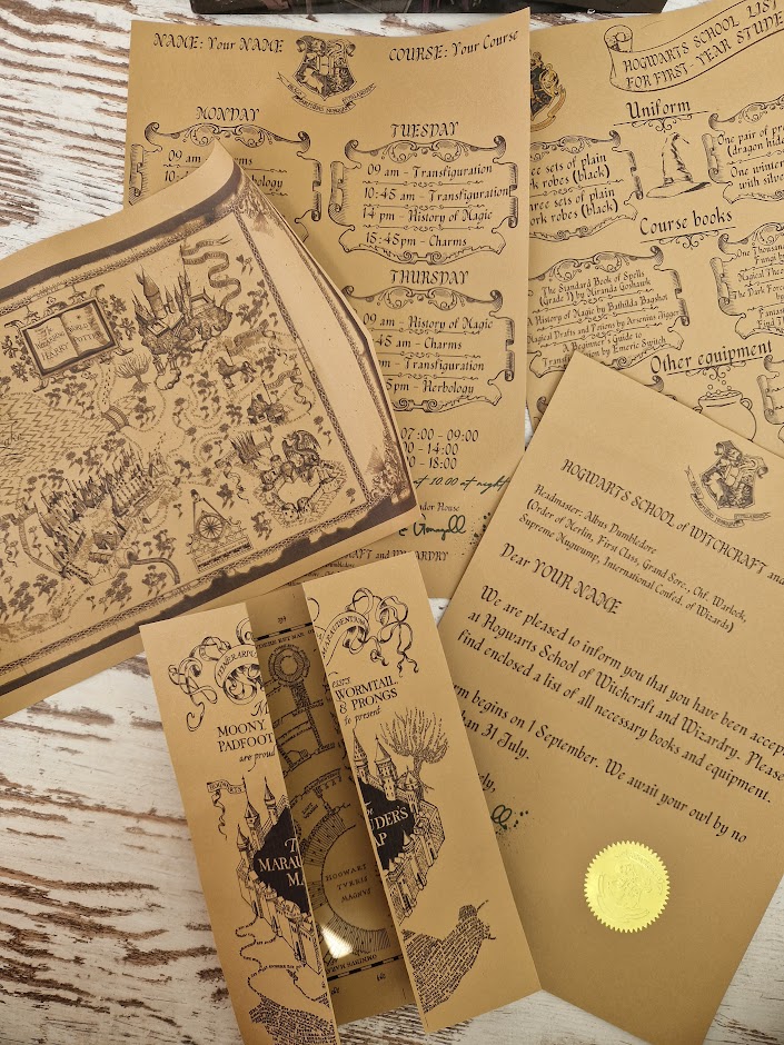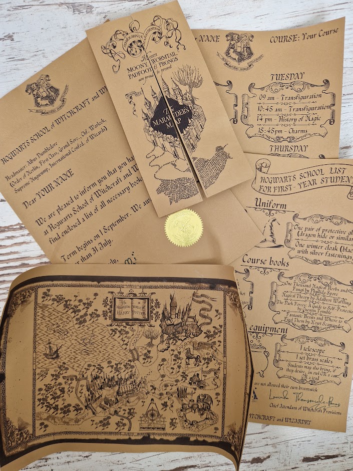 Set includes the following documents: Letter of admission to the school of witchcraft, a list of the first year of the school of witchcraft, a lesson schedule, a map of marauders, a Map of the magical world