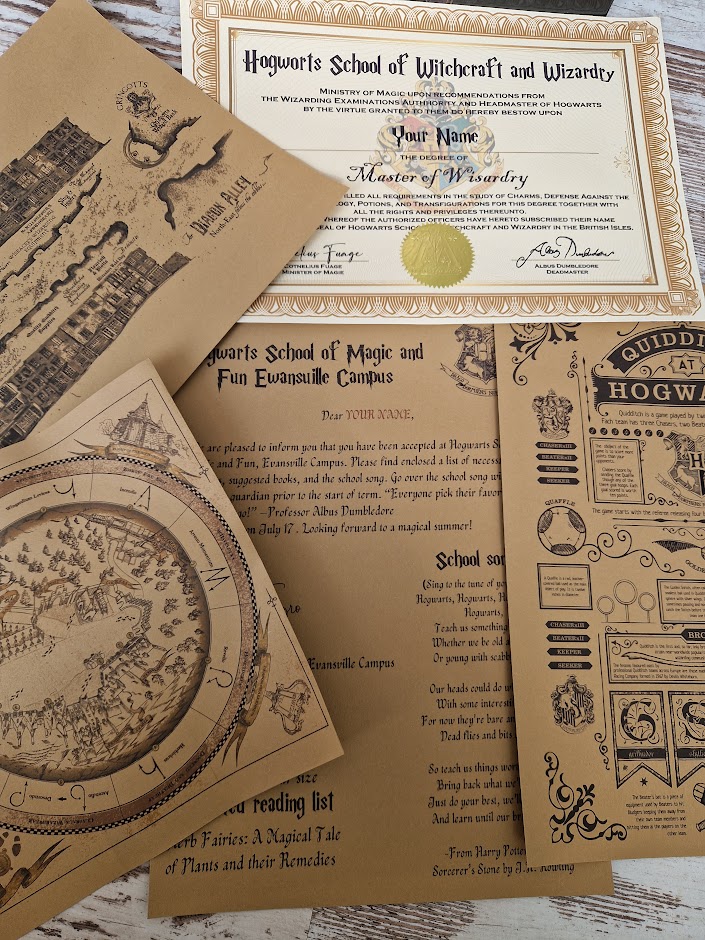 Printouts: Certificate of graduation from the School of Wizards, Store Map, Letter of invitation to the Campus, Newspaper, Knockturn Alley Map