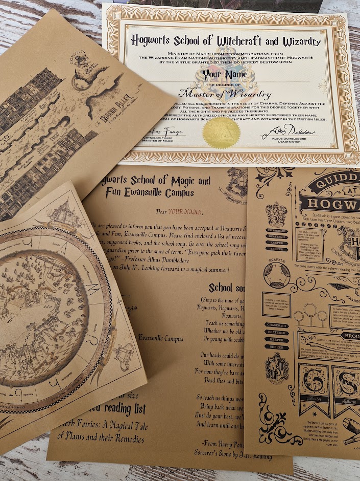 Set includes the following documents: Certificate of graduation from the School of Wizards, Store Map, Letter of invitation to the Campus, Newspaper, Hogsmeade Map
