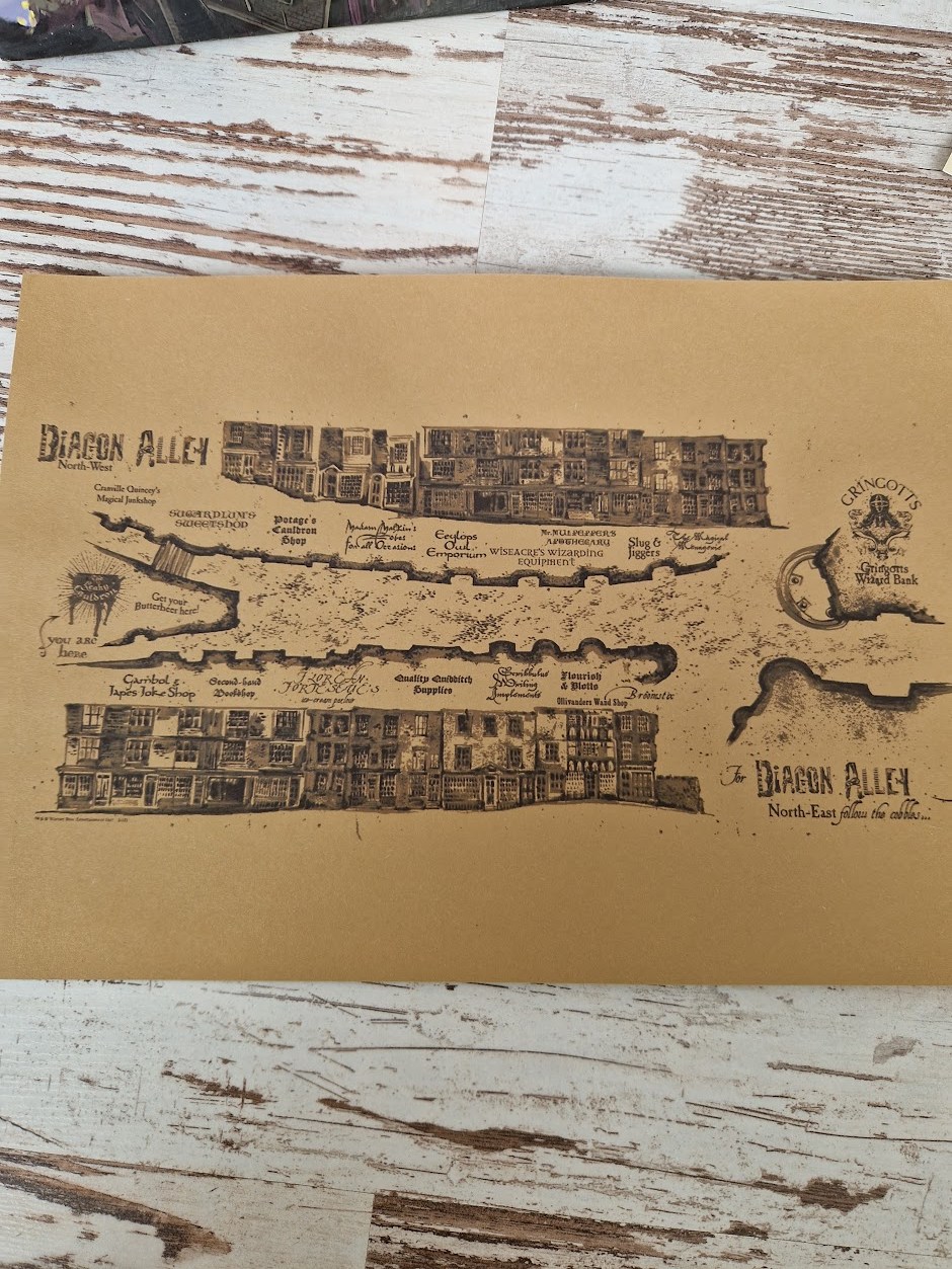 Lastly, the set includes a Map of Knockturn Alley, a dark and mysterious street in the magical world known for its shops selling cursed artifacts, forbidden potions, and dark magic supplies.
