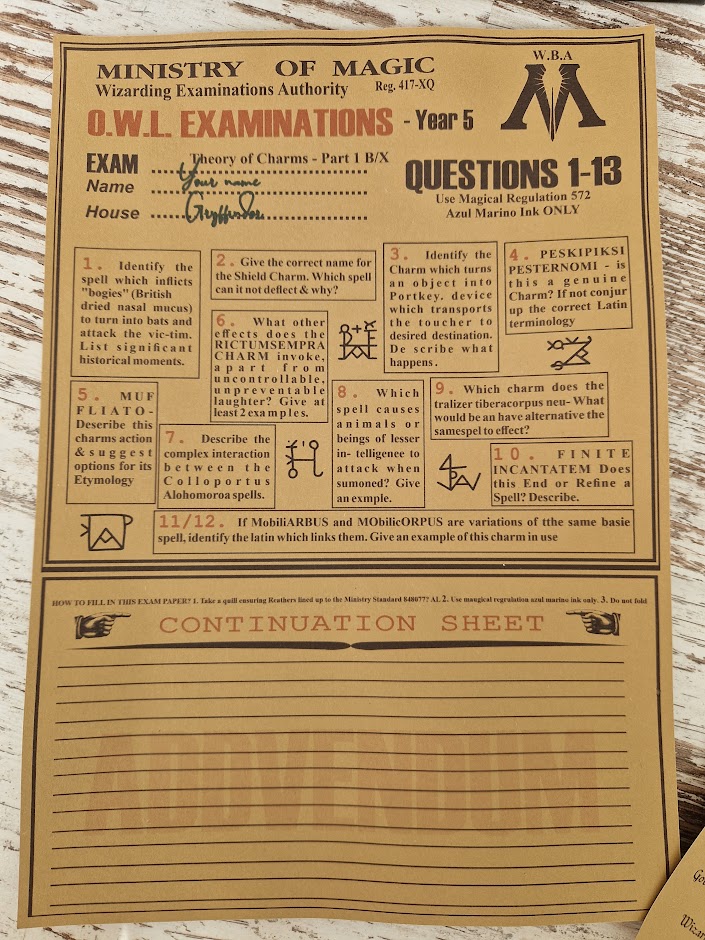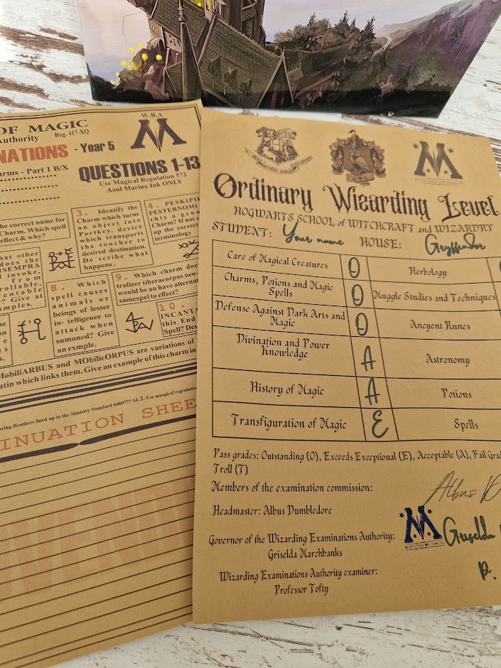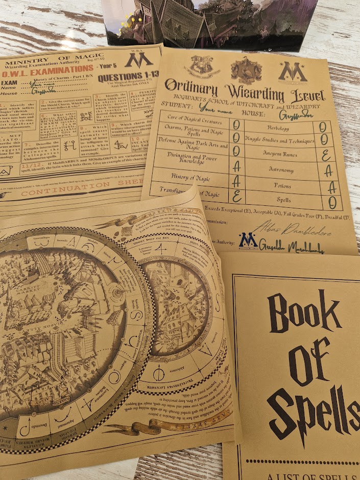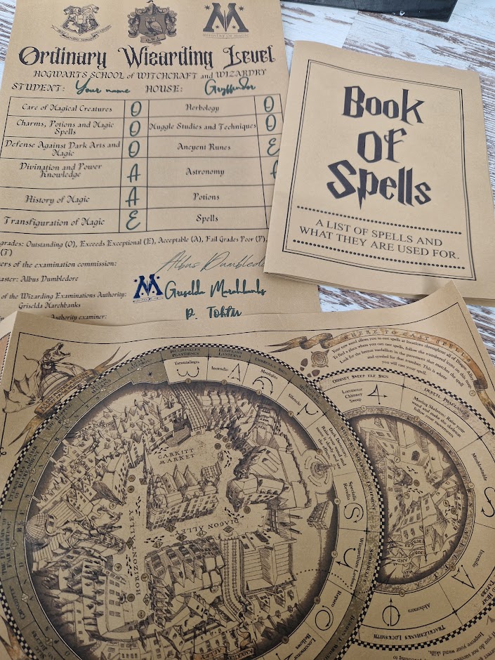 Set includes the following documents: Magic Exam, Sheet Rating sheet, Book of Spells, Alley Map